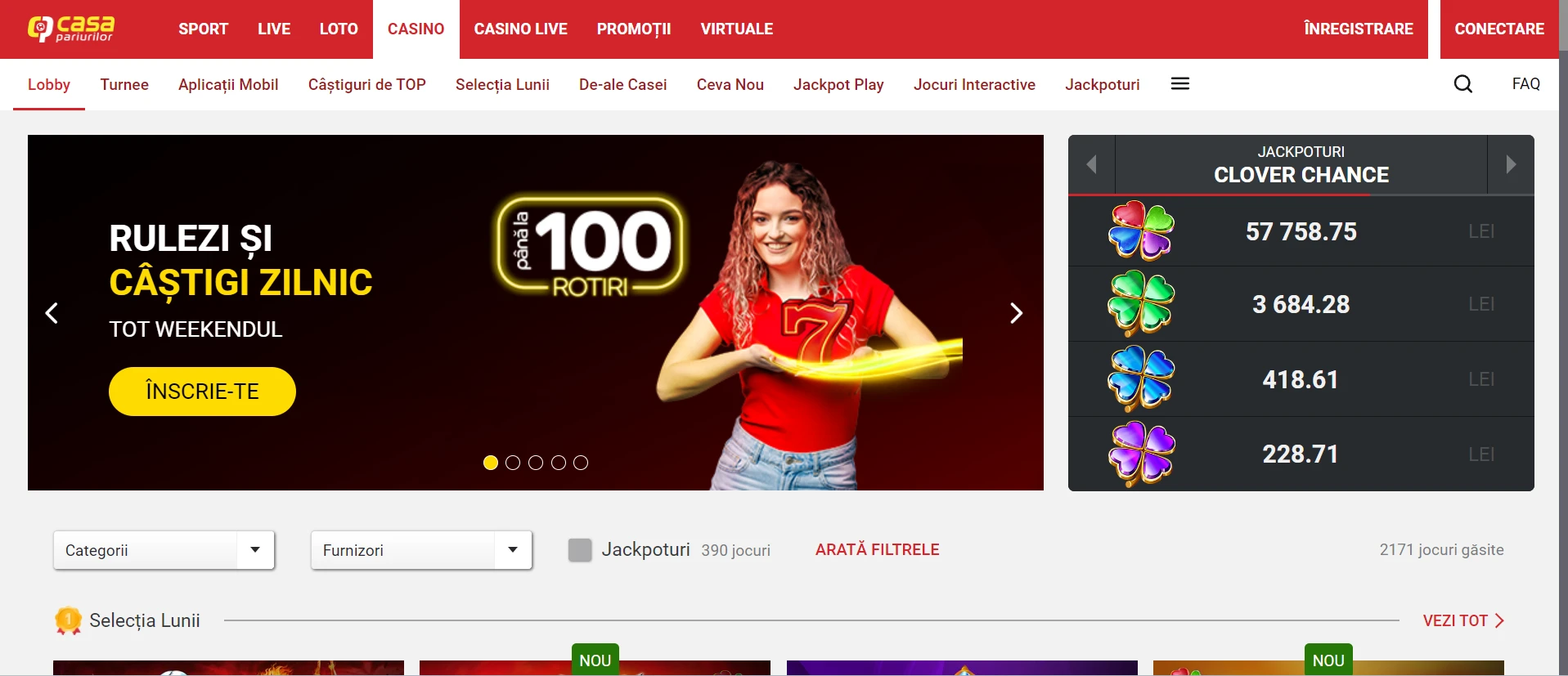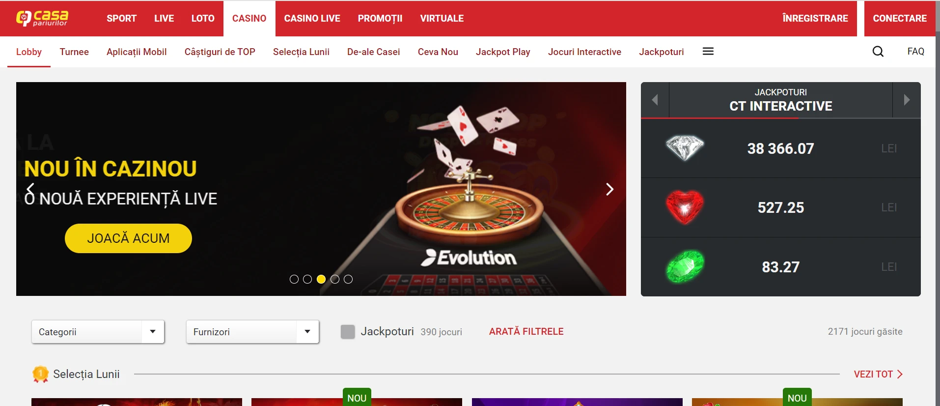 Casa Pariurilor Casino oferă o gamă diversificată de jocuri de cazino, adaptată pentru toate preferințele. Cu o selecție impresionantă de sloturi, jocuri de masă, și variante live, platforma oferă o experiență captivantă, susținută de dezvoltatori de renume mondial. Calitatea grafică și fluiditatea jocurilor creează o atmosferă realistă, iar diversitatea titlurilor disponibile asigură o experiență de joc unică pentru utilizatori.