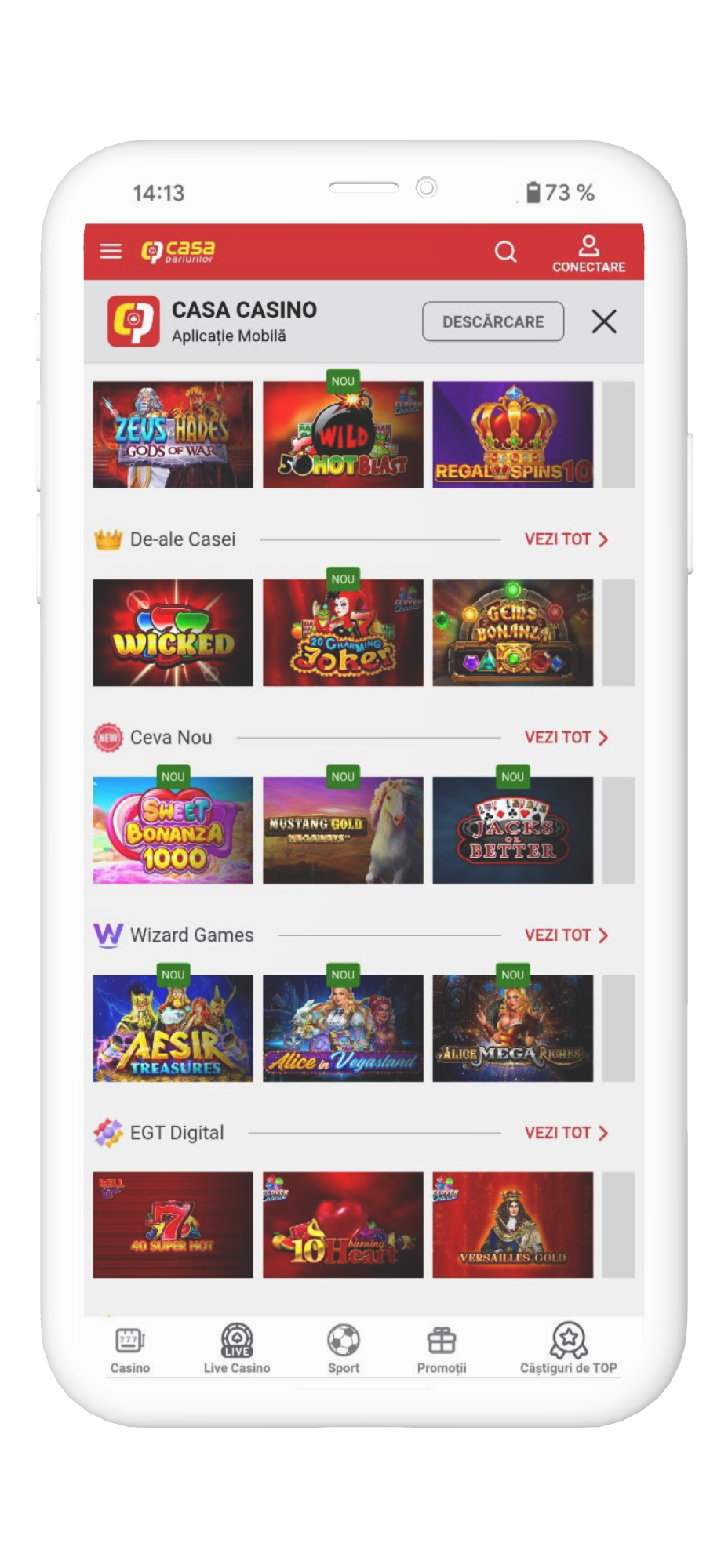 Funcții și opțiuni: Aplicația oferă acces complet la toate jocurile disponibile pe desktop, inclusiv sloturi, mese de cazino, și opțiuni de live casino. Interfața este optimizată pentru navigare ușoară și jocuri fluide. Poți gestiona contul, face depozite și retrageri, și accesa promoții exclusive direct din aplicație.