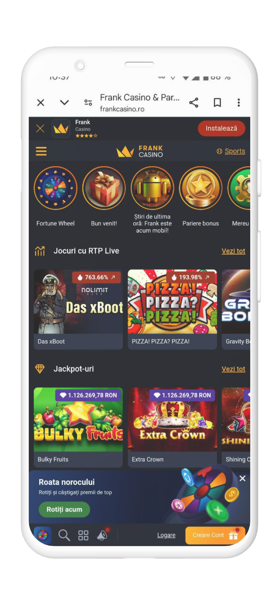 După ce aplicația s-a descărcat, instalează-o pe dispozitivul tău și urmează pașii pentru a te autentifica sau a crea un cont nou. Pentru utilizatorii de Android, aplicația poate fi descărcată direct de pe site-ul Frank Casino, deoarece Google Play nu permite aplicații de jocuri de noroc în anumite regiuni. Mergi la secțiunea de descărcare de pe site-ul Frank Casino, apasă pe linkul de descărcare și urmează instrucțiunile pentru a instala aplicația.