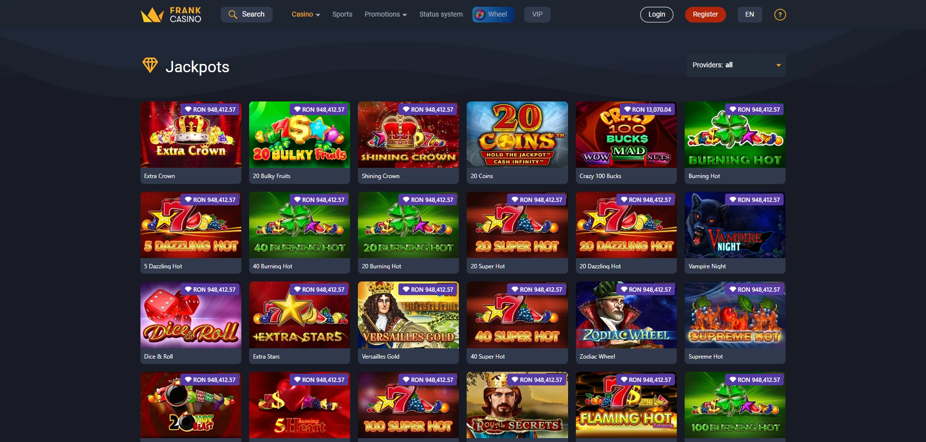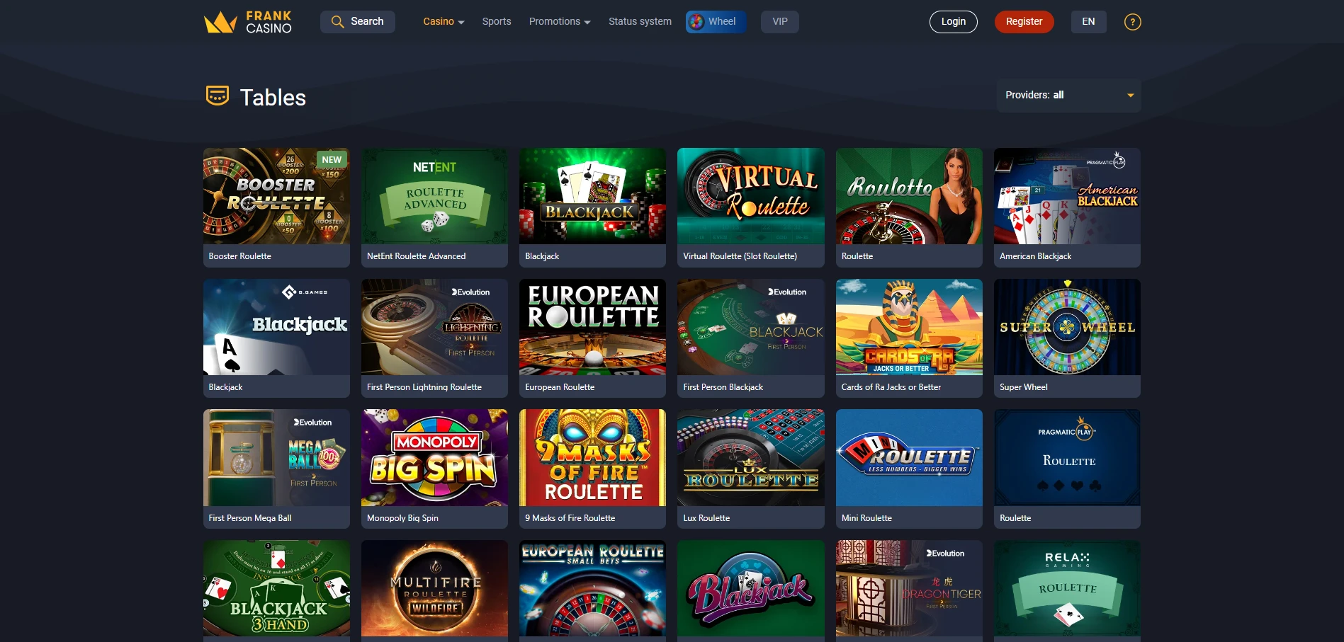 Frank Casino se distinge printr-o ofertă variată și captivantă de jocuri care satisfac gusturile diverse ale jucătorilor. De la sloturi inovatoare și jocuri de masă clasice, până la o experiență de live casino de înaltă calitate, platforma oferă opțiuni ample pentru toți utilizatorii. Grafica de înaltă definiție și interfața intuitivă contribuie la o experiență de joc fluidă și plăcută.