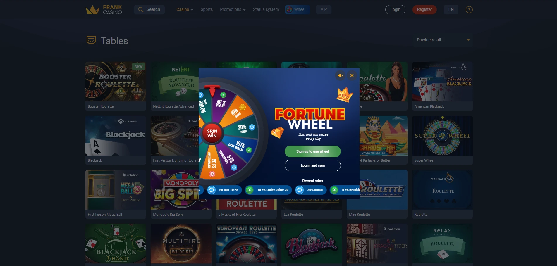 Frank Casino prezintă o gamă extinsă de sloturi, fiecare cu teme unice și caracteristici speciale. Sloturile populare includ titluri de la dezvoltatori de renume precum Pragmatic Play, Play'n GO, și Big Time Gaming. Aceste jocuri variază de la sloturi clasice cu 3 role la aventuri moderne cu multiple linii de plată și jackpoturi progresive. Sloturile populare, cum ar fi „Bell Link”, „Dog House” și „Sweet Bonanza” oferă bonusuri atractive și grafica captivantă, asigurând o experiență de joc emoționantă și potențial de câștiguri mari.