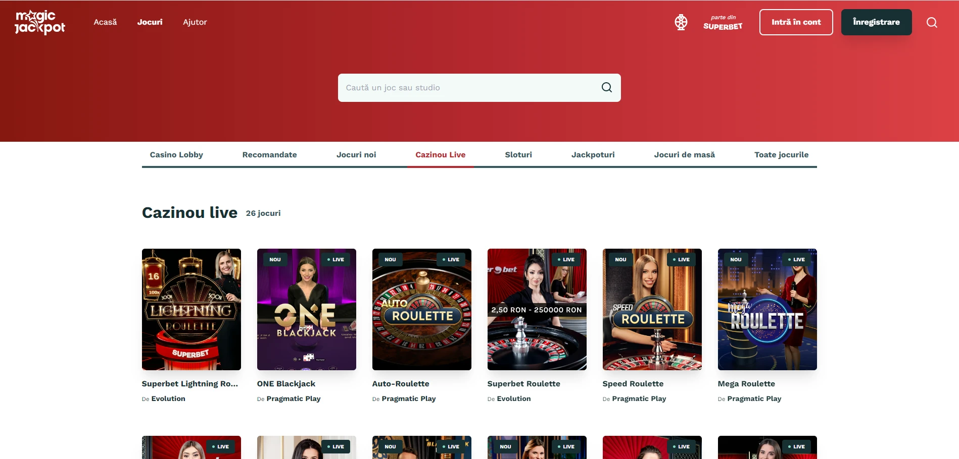 Magic Jackpot Casino îți oferă o experiență de cazino live de neegalat, cu jocuri ce includ dealerii în timp real și streaming de înaltă calitate, grație parteneriatelor cu furnizorii de top Evolution și Pragmatic Play. Atunci când te alături unui joc live, vei fi întâmpinat de dealeri profesioniști care asigură o atmosferă autentică și interacțiune reală, replicând experiența dintr-un cazino fizic.