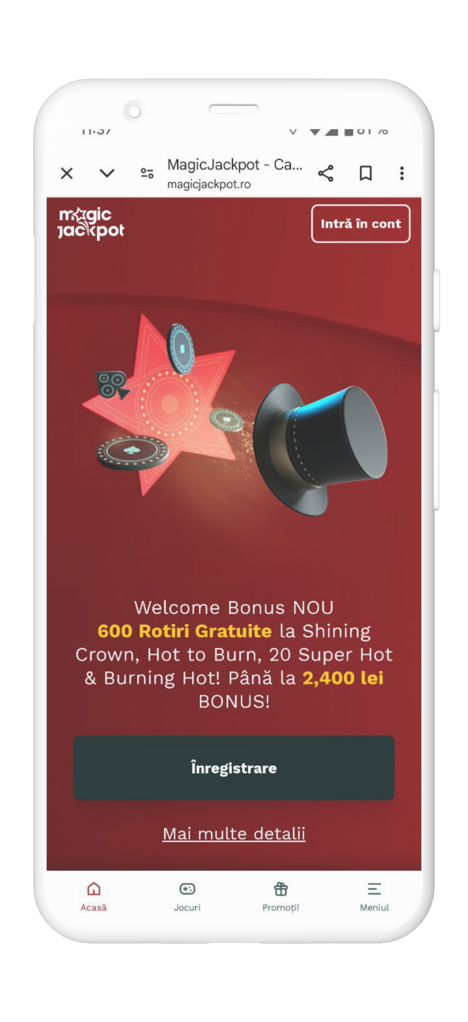 Pentru a accesa MagicJackpot Casino de pe mobil, deschide browserul tău și vizitează magicjackpot.ro. Site-ul este conceput pentru a se adapta la dimensiunile ecranului și pentru a oferi funcționalități complete, inclusiv acces la jocuri, gestionarea contului și efectuarea tranzacțiilor financiare. Interfața intuitivă permite navigarea ușoară între diferitele secțiuni ale cazinoului, iar jocurile sunt optimizate pentru a funcționa fără probleme, chiar și pe conexiuni de internet mai lente.